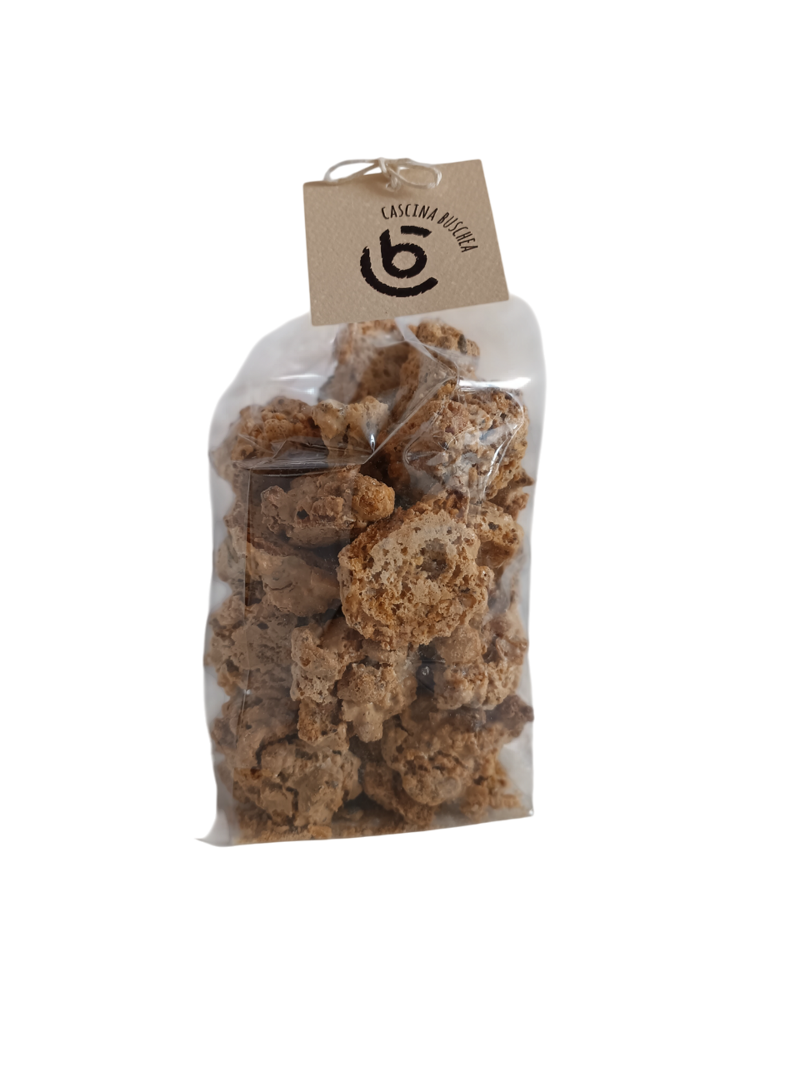 Biscotti prodotti con nocciole in granella, albume d'uovo e zucchero. La loro consistenza croccante e asciutta avviene grazie all doppia cottura, prima in pentola e successivamente in forno.